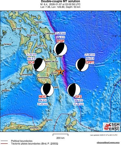 На Филиппинах - 7 января 2026 - произошло землетрясение магнитудой 6.4 на глубине около 26 - 36 км.