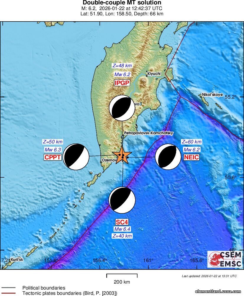 У Камчатки - 22 января 2026 - произошло землетрясение магнитудой 6.2 на глубине около 14 - 60 км.